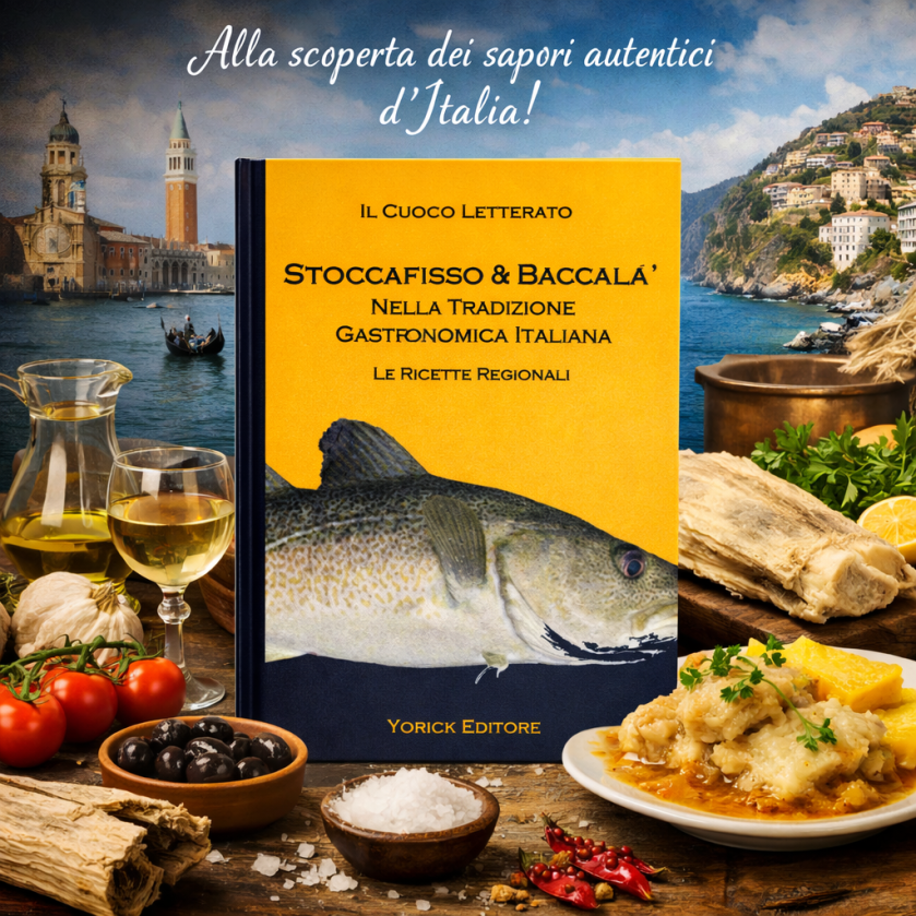 “Stoccafisso e Baccalà nella tradizione gastronomica italiana“, edito da Yorick Editore per Il Cuoco Letterato, è un viaggio affascinante nel cuore della cucina italiana, alla scoperta di due protagonisti intramontabili della nostra tradizione gastronomica. Con uno stile chiaro e coinvolgente, il libro intreccia storia, cultura e sapori, raccontando come stoccafisso e baccalà abbiano attraversato secoli e regioni, diventando simboli di convivialità e identità locale.