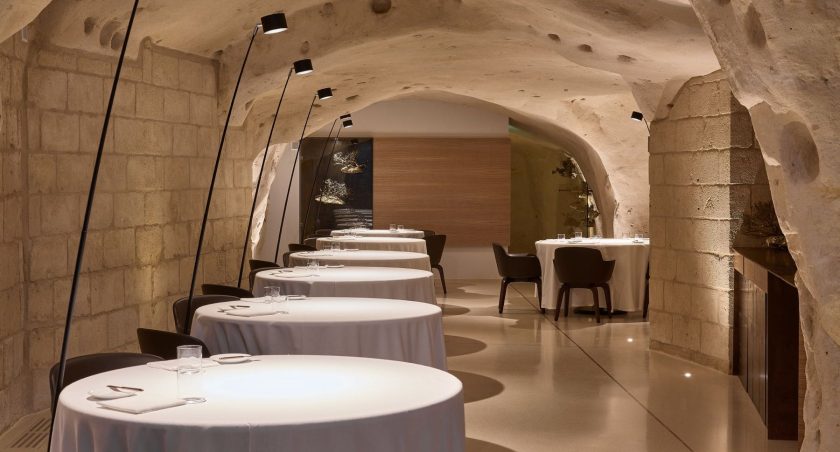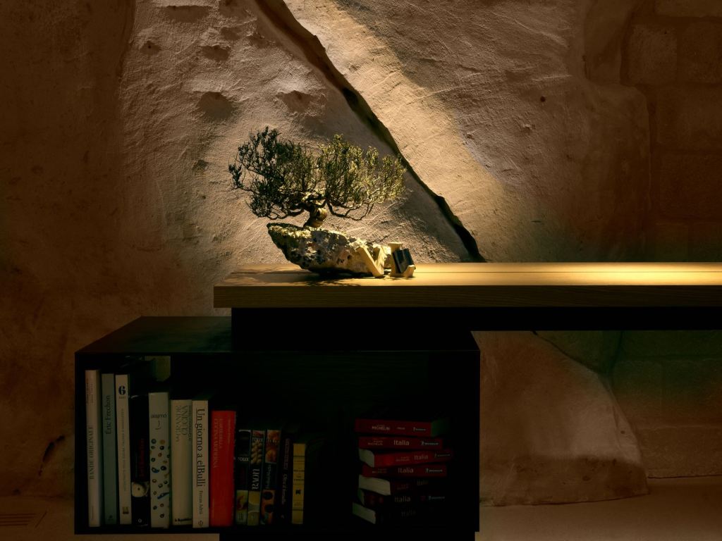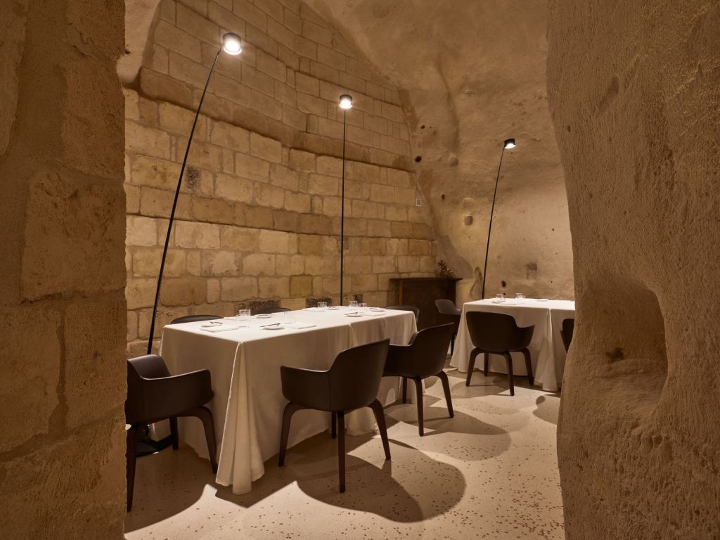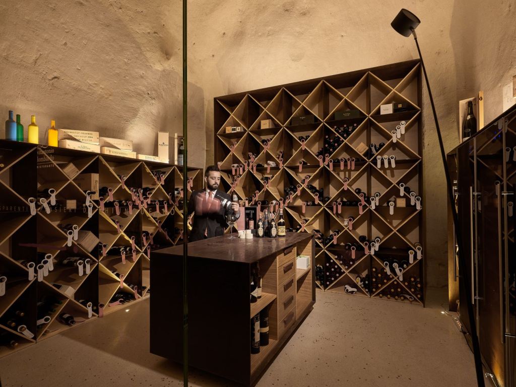 Una grotta del Rione Sassi lasciata al suo fascino naturale di proposito, su progetto dell’architetto Alessandro Tortorelli e desiderio di Vitantonio che ha scelto Matera ispirato da un luogo in cui cavità e convessità della pietra possono davvero dar vita ad esperienze di gusto senza tempo.