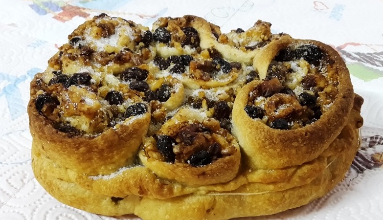 Procedimento Preparazione ripieno Lavare l’uvetta lasciandola a bagno per 10 minuti, asciugarla bene, mettere tutti gli ingredienti in una ciotola, mescolando tutto, fare riposare 3/4 ore. Preparazione pasta esterna In un pentolino mettere a riscaldare tutti i liquidi, versare in una ciotola e aggiungere lo zucchero e la farina, mescolare con una forchetta, passare l’impasto sulla spianatoia, impastare bene ottenendo un impasto liscio, omogeneo. Preparazione rose Prendere un pezzo d’impasto, stenderlo con il matterello in una sfoglia sottile e fare una forma rotonda più grande della teglia che la deve contenere. Dividere il resto della pasta in 2/3 pezzi, stenderli in rettangolo, tagliare delle strisce larghe circa 10 cm e lunghe a piacere, spennellare con olio, zucchero e cannella , distribuire il ripieno solo su metà del rettangolo, raddoppiare e arrotolare a forma di rosa. Disporle sulla base aprendo con le dita i bordi delle rose, sollevare i bordi della sfoglia posta sotto, legare con uno spago affinché le rose stiano ben strette e non si aprano. Cuocere in forno preriscaldato a 170°/ 180° per un’ora, deve dorare, ma essere ben cotta all’interno. Durante la cottura irrorare di miele caldo, così acquista un bel colore ambrato. Dopo cotta, aggiungere miele caldo zucchero e cannella.