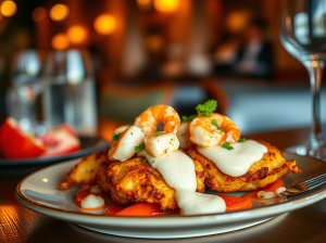 Frittelle di granchi, con gamberoni e salsa di rafano
