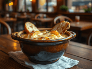 Preparazione: Le cipolle vanno fatte rosolare nel burro, aggiungendo un cucchiaio di farina prima (avendo cura di mescolare) e il brodo di carne poi, con sale e pepe, che dovrà essere fatto bollire per circa mezz’ora. Dorare nel frattempo, sempre nel burro, anche le fette di pane. Una volta pronte posizionarle sul fondo di una pirofila, versando un mestolo di minestra e parte del groviera, e ripetendo la stratificazione per tre volte, terminando con il formaggio. Passare sotto al grill del forno per circa cinque minuti fino a gratinare la superficie. Servire ben caldo.