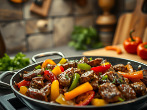 Ingredienti (per quattro persone): 400 g circa di vitellone tagliato a striscioline, 3 piccoli peperoni, meglio se di colori diversi, una cipolla bianca, una scatola di pelati, 1 foglia di alloro, 1 dado da brodo, 1 spicchio d’aglio, sale grosso, un po’ di origano secco.